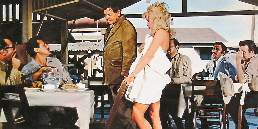Like most “classic” cinema, Rage is chock full of #MeToo moments. The sexploitation angle starts right off the bat during the credits when a dump truck full of dancing girls covered by a tarp barreling down the road hits a rock and the girls are forced to get out and push. When one of the girl-transporters slaps Perla (Stevens) on her ass, which is packed into a tight pink dress, and tells her it will make her back strong, she yells back, “That’s not my back, stupid!” and throws a rock at him. Cut to an explosion on the side of the mountain, as if to reinforce her righteous indignation, and to establish the prime location of the film: a construction company building a tunnel through a mountain, stationed near a small, dusty mining camp. It’s a scenario perhaps borrowed from Clouzot’s 1953 The Wages of Fear (and reiterated in Friedkin’s 1977 Sorcerer), of which Rage is a cheap but satisfying variation.