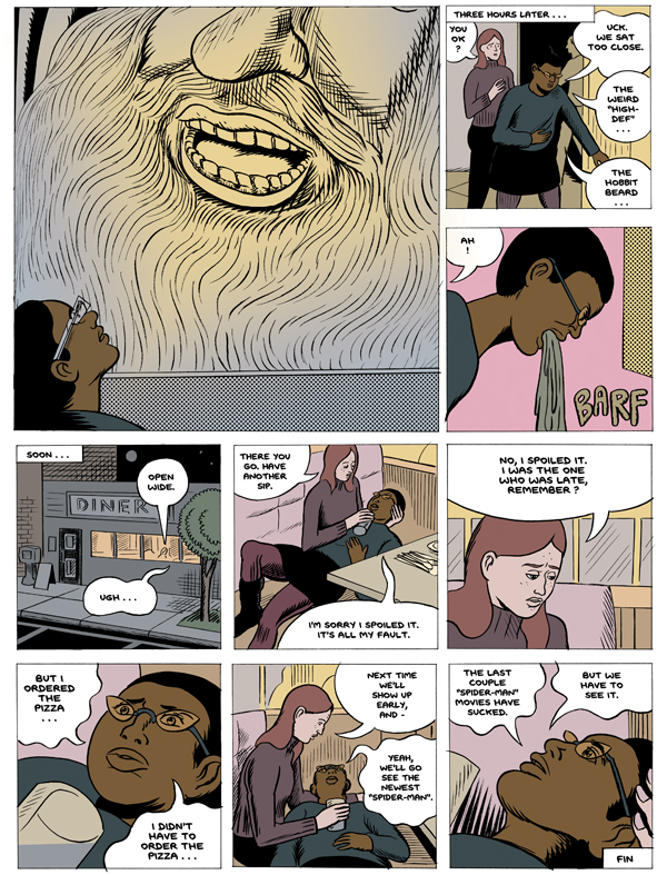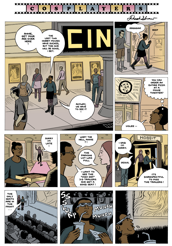 While drawing My Entire High School Sinking into the Sea, I did a series of pamphlet comics titled Cosplayers. The character Verti appears in both stories, partly inspired by how Osamu Tezuka would use the same character designs across different comics. The Cosplayers stories are little allegories about how people relate to and use popular culture. This short story is about being excited to see a blockbuster movie, being disappointed by it, but still holding out hope that the next blockbuster will be good– something we all can relate to! My Entire High School Sinking into the Sea is my dream blockbuster movie: an explosive, disaster art film. A collection of Cosplayers short stories appear in the book Cosplayers: Perfect Collection (Fantagraphics), the “perfect collection” a reference to anime box sets. Thanks for reading, and thanks, Talkhouse, for hosting this online.