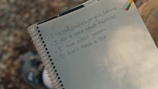 After Jamie lets himself think gay thoughts for the first time, he panics and tries to reason his way out of it. Originally, I thought he’d try Googling “how to be straight again,” but that felt too obvious. When we shot the scene, we had him listing out “Beautiful Women” in his notebook. That felt like a bit too much of a dismissible joke. I wanted this detail to feel a little more specific and serious in order to vividly evoke that panic. Our producer Allison Tate and I went back and forth on it a lot. Then it hit us at pretty much the same moment: it should be an untitled list of reasons he might still be straight. We grabbed a pickup shot of it (with our editor Erik Vogt-Nilsen’s handwriting standing in for Jamie’s) and it’s one of the moments in the film I am the most proud of.