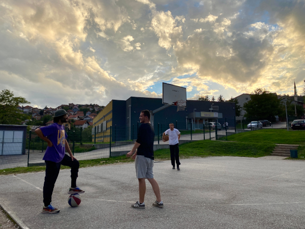 This was my first trip in the post-COVID world. The photo was taken by our cinematographer, Jesse McCracken, who probably sensed the joy I felt while shooting hoops with Hamza at sunset in Buća Potok.