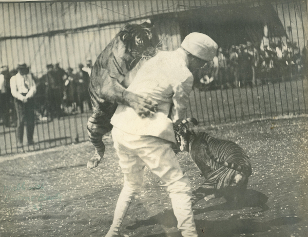 Mabel invented a daring trust game when she trained a tiger to do something no man would attempt. She taught one of her favorites, Rajah, to wrestle her. In the ring, during the show, she would have her back to Rajah. Suddenly, Rajah would leap at her back and brought Mabel to the ground. As the pair wrestled, with Rajah taking a hold of her arm or leg, the audience would gasp. It was all carefully orchestrated, but occasionally, Rajah would get carried away. Mabel was confident, though, that she could get him back in line and not walk away too badly hurt.