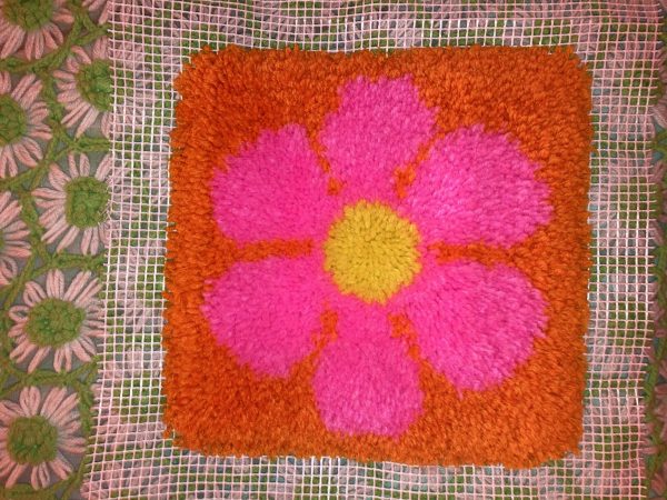 The thing that’s been bringing me a lot of joy recently is latch-hooking — basically, the craft where you use yarn and hook it through a canvas and make a little rug or tapestry out of it. I got into it sort of randomly. I lived with Colleen Green for a few months during the pandemic, and she had this amazing vintage latch-hook tapestry hanging in the house, and I always looked at it like, I wanna make something like that! Just through researching how to start, I found this artist on Esty who has a business called Bobcat and Birdie, and she sells latch-hooking kits for anyone who wants to get started. They’re really cool, because she includes a zine that she made on how-to latch-hook, a latch-hooking tool, a yarn-cutting guide, and a pattern that you can use. It’s awesome, because traditionally in latch-hooking kits they’ll provide pre-cut yarn for you, but with her kit you bring your own yarn — she calls it BYOY — so you can pick out all your own colors.